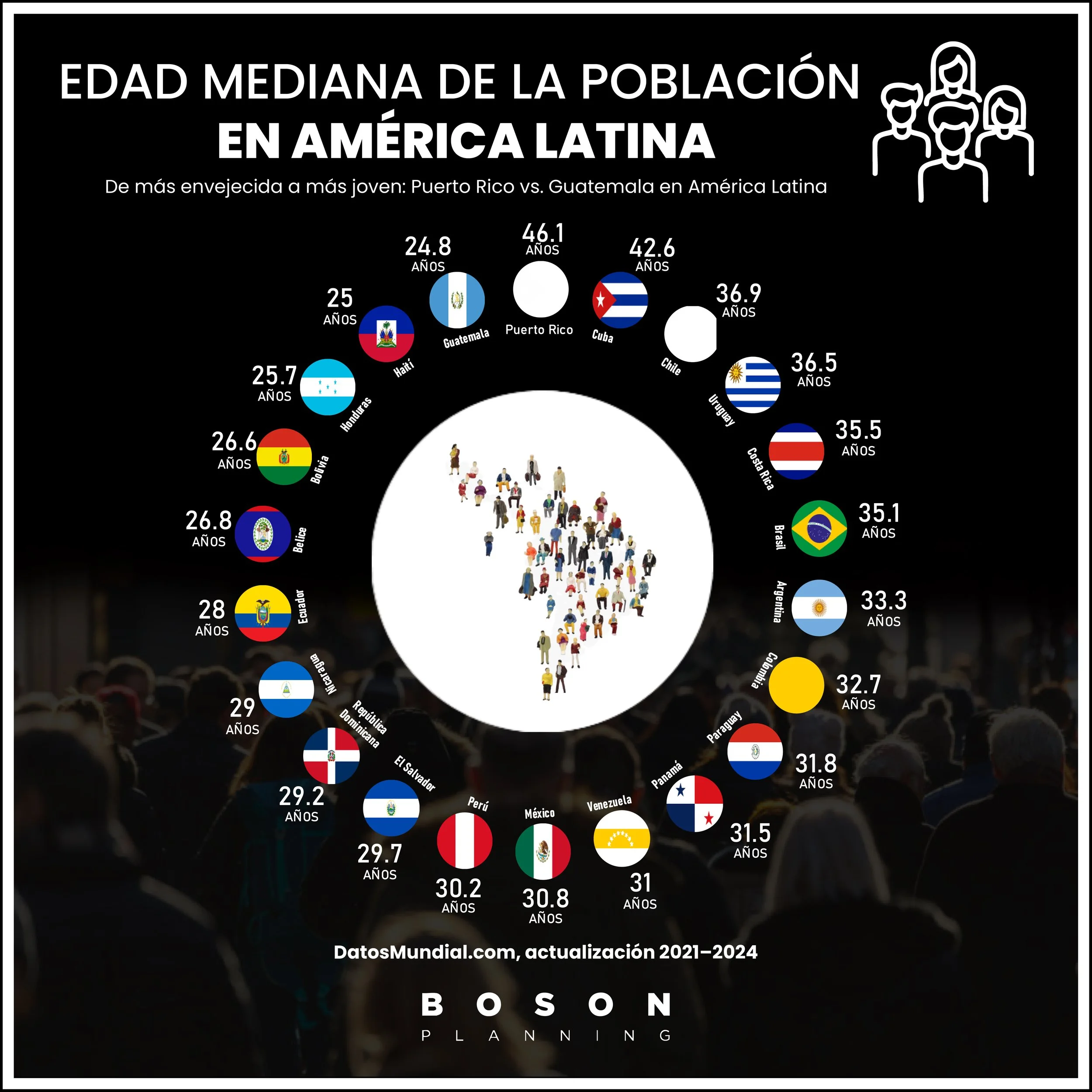 ¿Qué nos revela una sola cifra—la edad mediana—sobre el presente y el futuro de América Latina? Más de lo que imaginas. La infografía que compartes muestra, de un vistazo, cómo se reparte la mitad más joven y la mitad más adulta de nuestras poblaciones. Y ahí aparece un contraste potente: Puerto Rico y Cuba lideran el grupo de países más envejecidos (con Puerto Rico en la cima), mientras Guatemala cierra la rueda como el país más joven. Entre ambos extremos se ordena el resto del mapa latinoamericano.